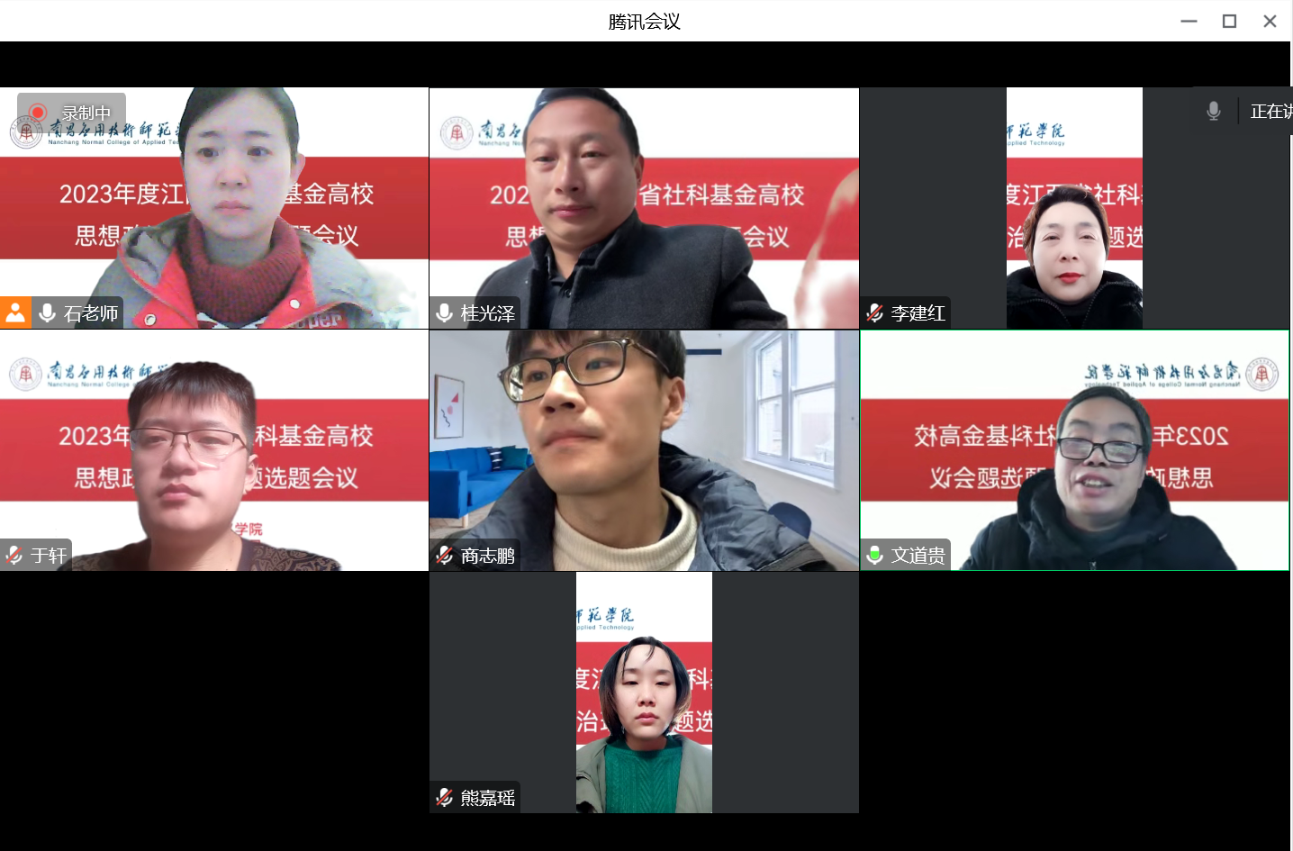 2023年1月20日,pp电子召开课题申报线上会议,pp电子官网按照课题申报通知及学校党委指示,认真学习和研究江西省社会科学界联合会、江西省教育厅《关于组织开展2022年度江西省社科基金高校思想政治理论研究专项申报工作的通知》,积极组织pp电子官网思政专职教师参加专项申报工作。会议由党总支副书记桂光泽主持,院长文道贵、思政教研室6位申报课题的专职教师参会。
