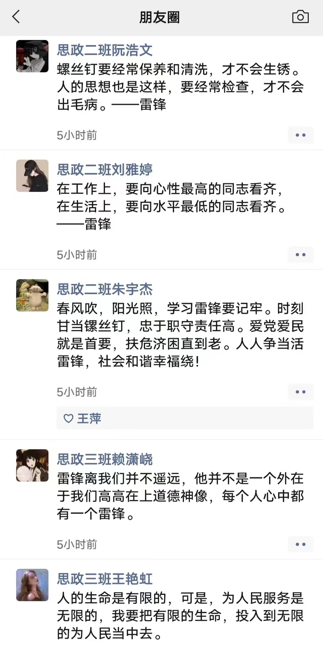 pp电子官网青年充分利用朋友圈这个新兴媒体来宣传雷锋语录,向身边的人积极传播雷锋精神。号召大家向雷锋学习,传承中华民族传统美德,助力“雷锋精神”弘扬与传承,让“雷锋精神”在新时代绽放更加璀璨的光芒。
