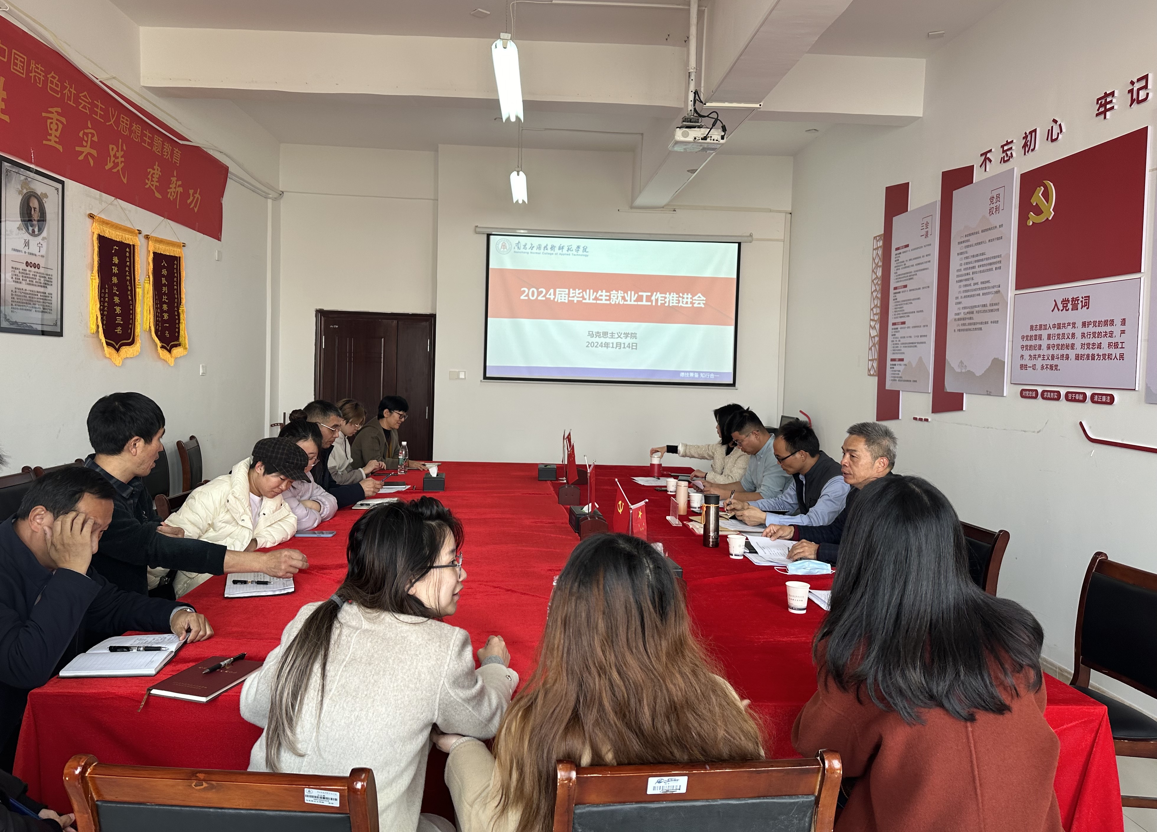 pp电子于2024年1月14日在1511会议室召开2024届毕业生就业工作推进会,此次会议由院长文道贵主持,校党委副书记蓝贤发、马院党总支书记张欣康、副书记李婷、各论文实习指导老师及毕业班辅导员参会。