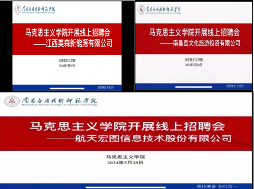 pp电子于2024年5月30日召开了线上就业招聘会。本次会议邀请到了江西美森新能源有限公司、航天宏图信息技术股份有限公司、南昌县文化旅游投资有限公司相关负责人参会,学院党总支副书记李婷、毕业生辅导员、全体毕业生参加。会议由就业专员朱文清主持。