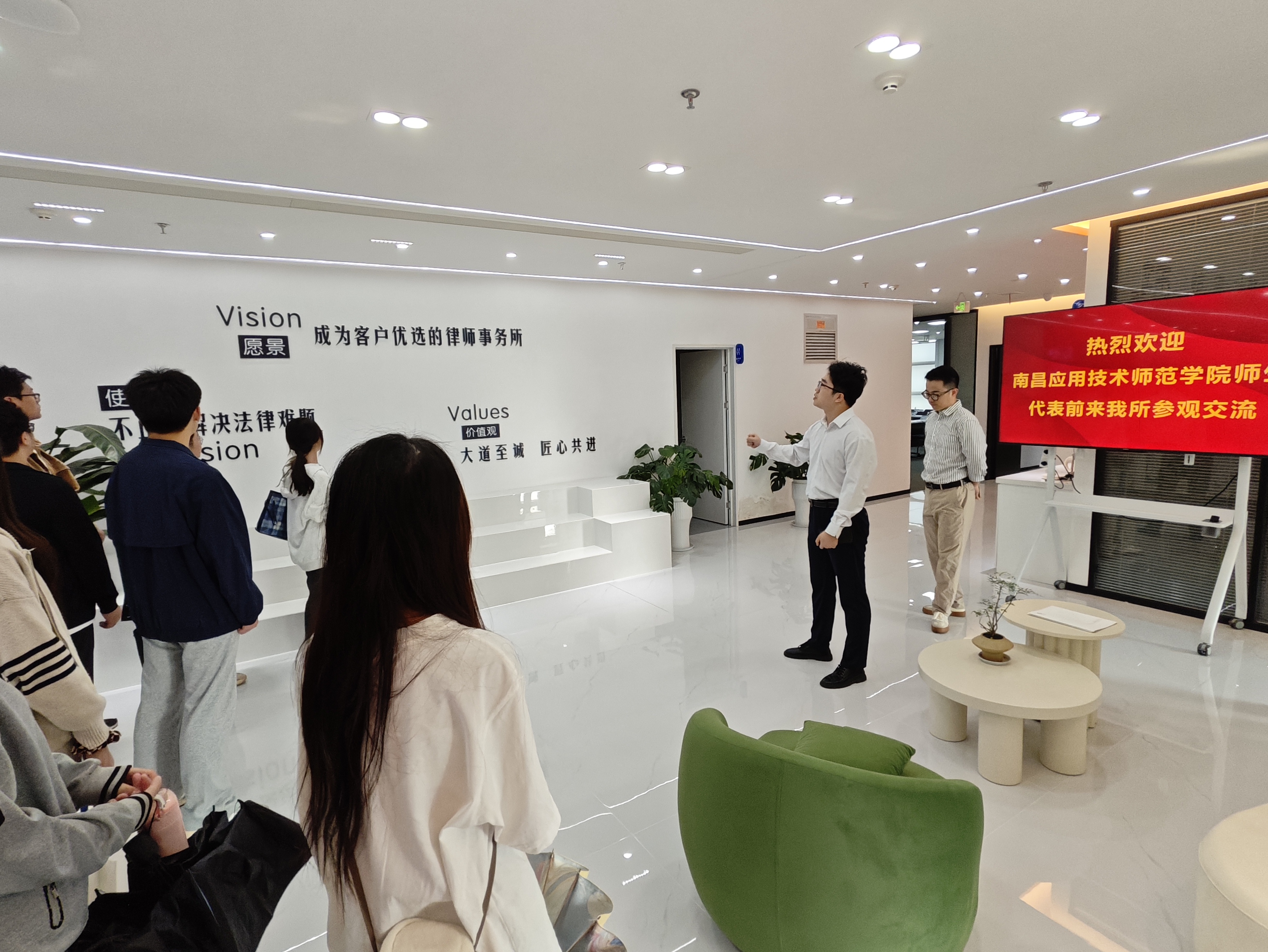 为增强法学专业毕业生对律师行业的直观了解,明确自身职业定位,提升就业竞争力,10月10日早,pp电子组织本院法学专业毕业生到段和段(南昌)律师事务所进行参观学习活动。参与此次活动的有pp电子就业专员朱文清、毕业班辅导员陈伟辉、汤益尊以及14名法学专业学生代表。