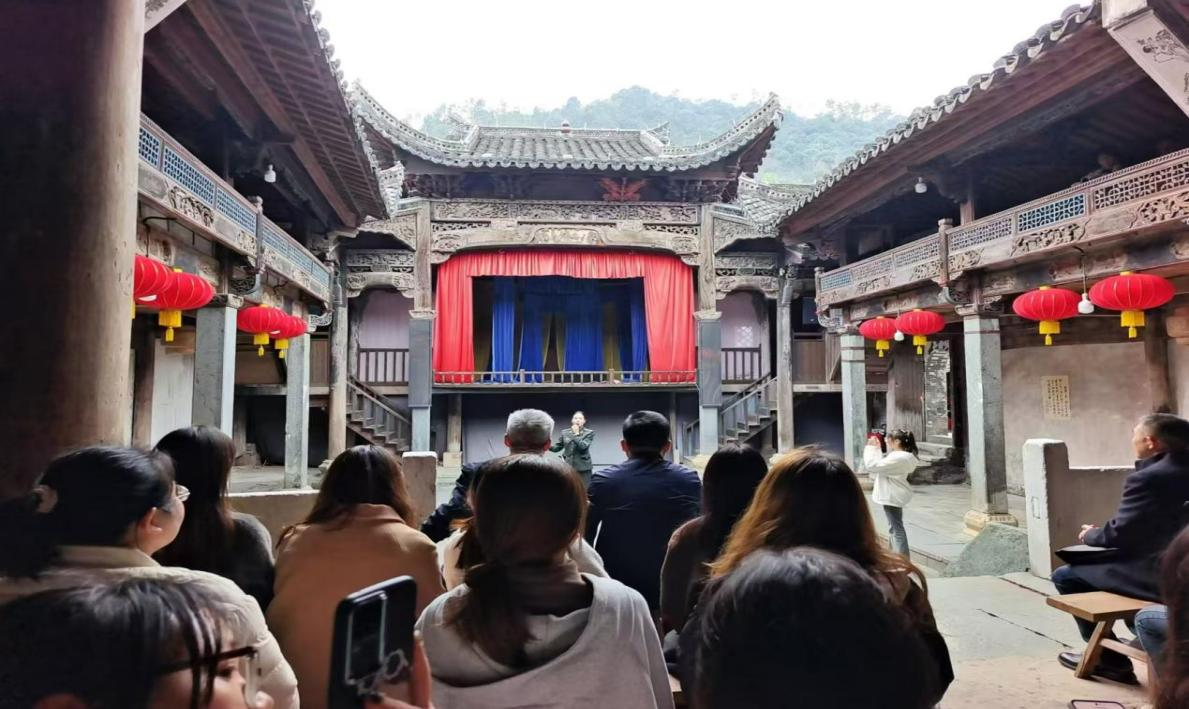 穿过小河畔,踏过青石板路,队员们来到了程氏宗祠。这座宗祠展示了徽派“三雕”艺术的精湛技艺,木雕精美绝伦。宗祠内还保存着一个完整的古戏台,这里曾是抗日誓师动员大会的召开的地方。在指导老师的带领下,队员们学唱了《新四军军歌》,嘹亮的歌声在古戏台上空回荡,激发了队员们的爱国热情和革命精神。