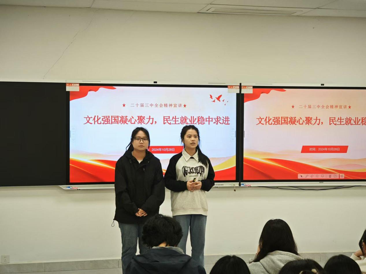 pp电子“星火宣讲团”在10月28日为2024级思想政治教育专业的同学们带来了一场以“文化强国凝心聚力,民生就业稳中求进”为主题的党的二十届三中全会精神宣讲。