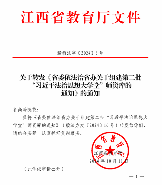 近日,江西省教育厅下发了《关于转发《省委依法治省办关于组建第二批“习近平法治思想大学堂”师资库的通知》(赣教法字〔2024〕8号)》的通知文件,确定了70位讲师入选全省第二批“习近平法治思想大学堂”师资库。pp电子官网副教授刘德彰成功入选。