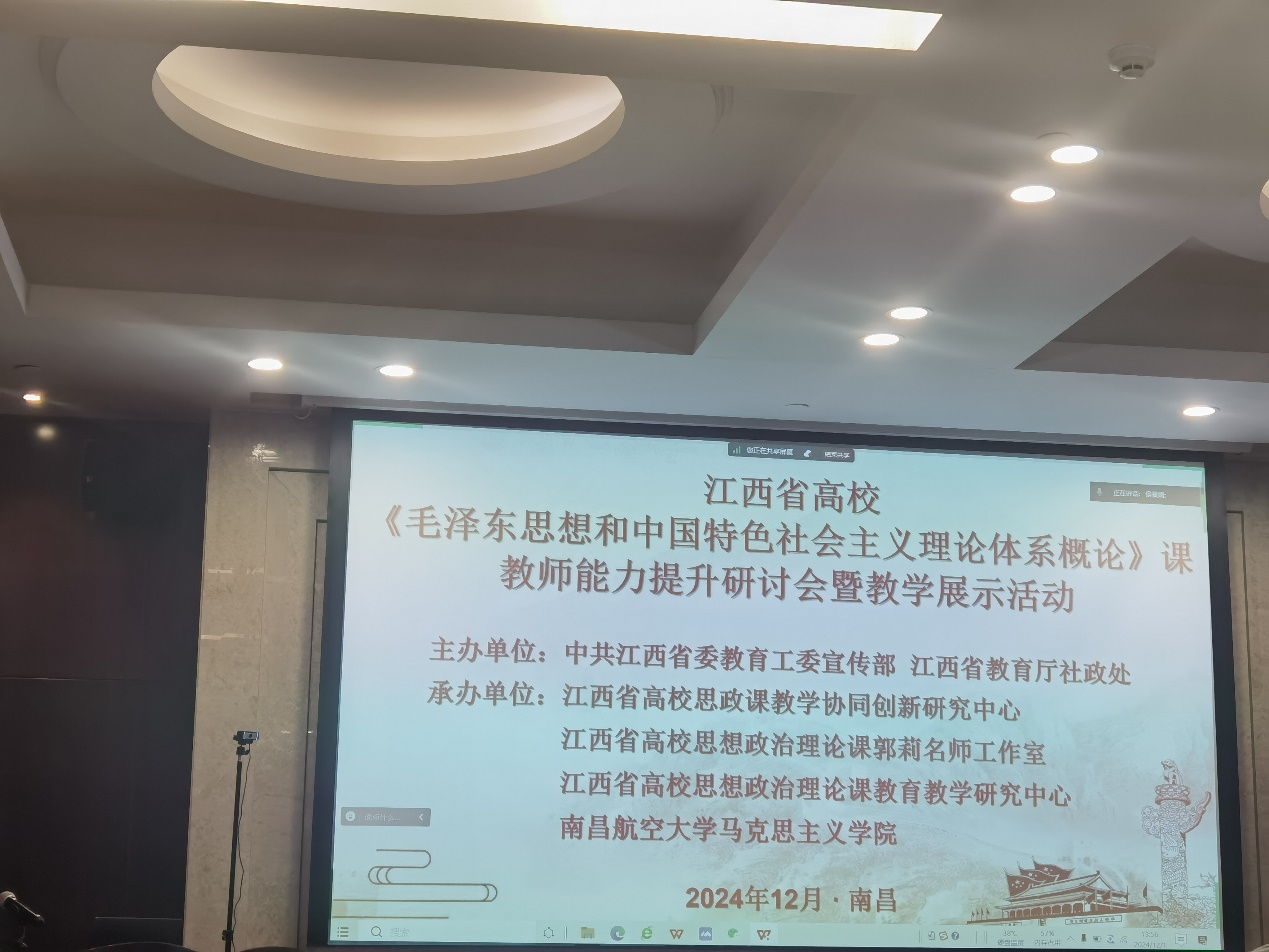 2024年12月1日,由中共江西省委教育工委宣传部、江西省教育厅社政处主办的《毛泽东思想和中国特色社会主义理论体系概论》课教师能力提升研讨会暨教学展示活动在南昌市前湖酒店举行。pp电子官网思政教师刘东方参加了活动。