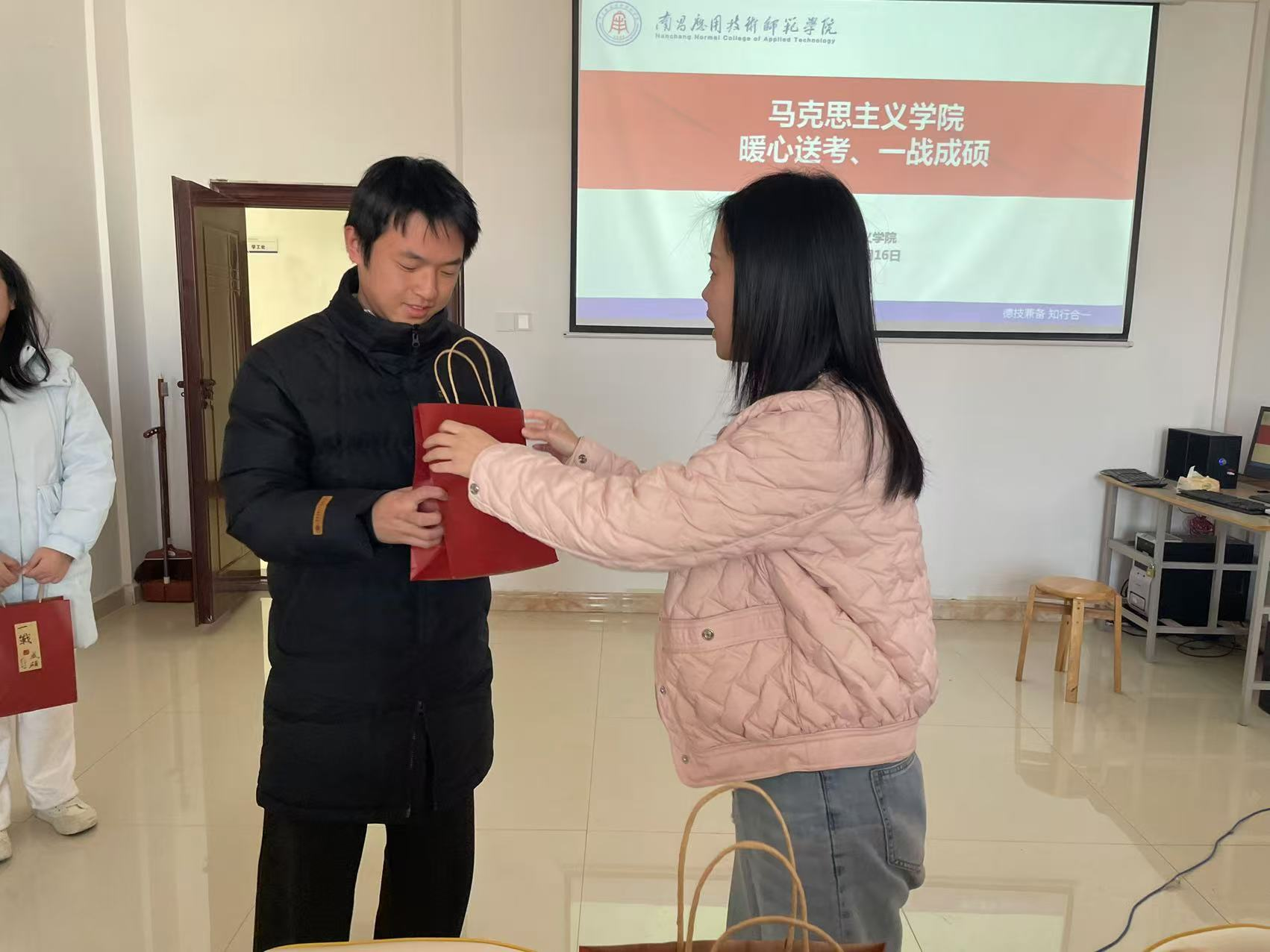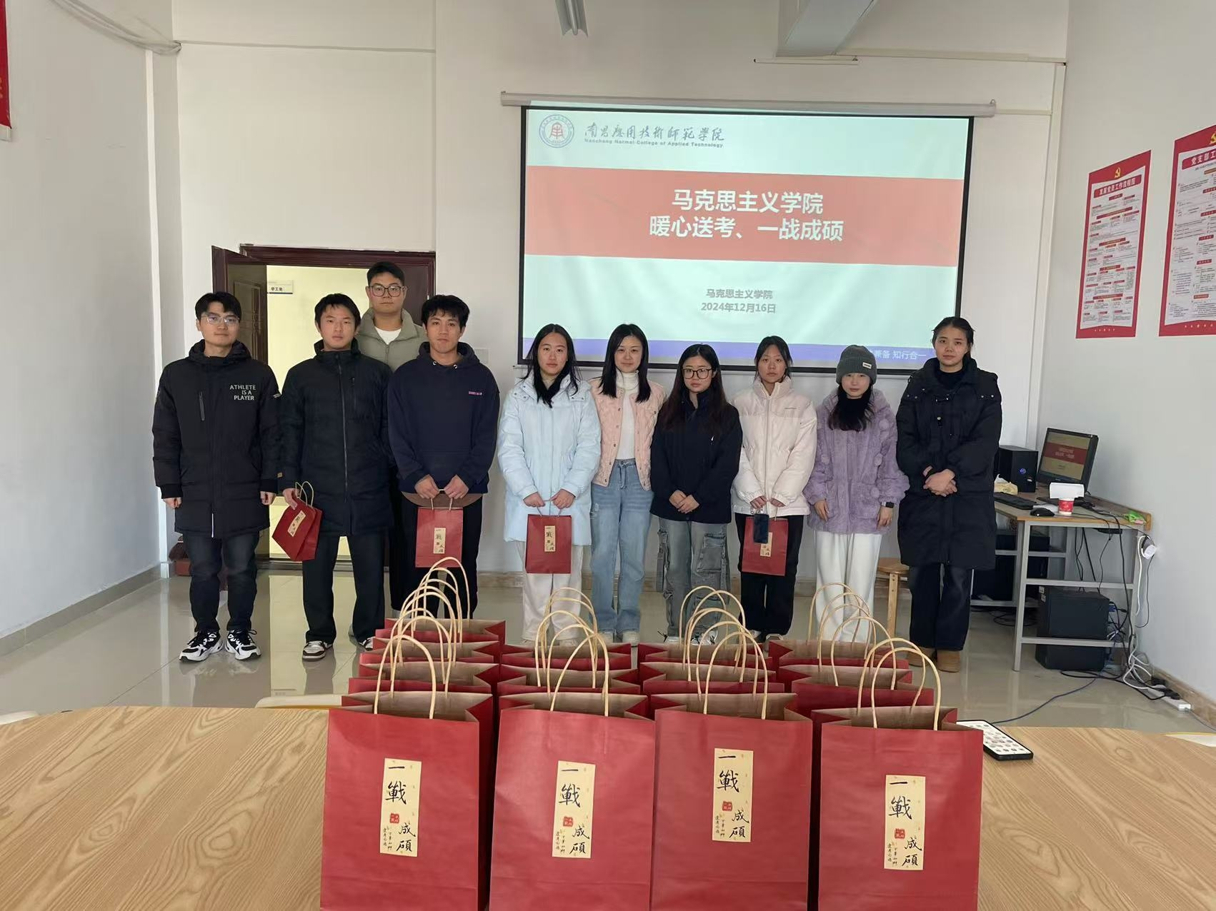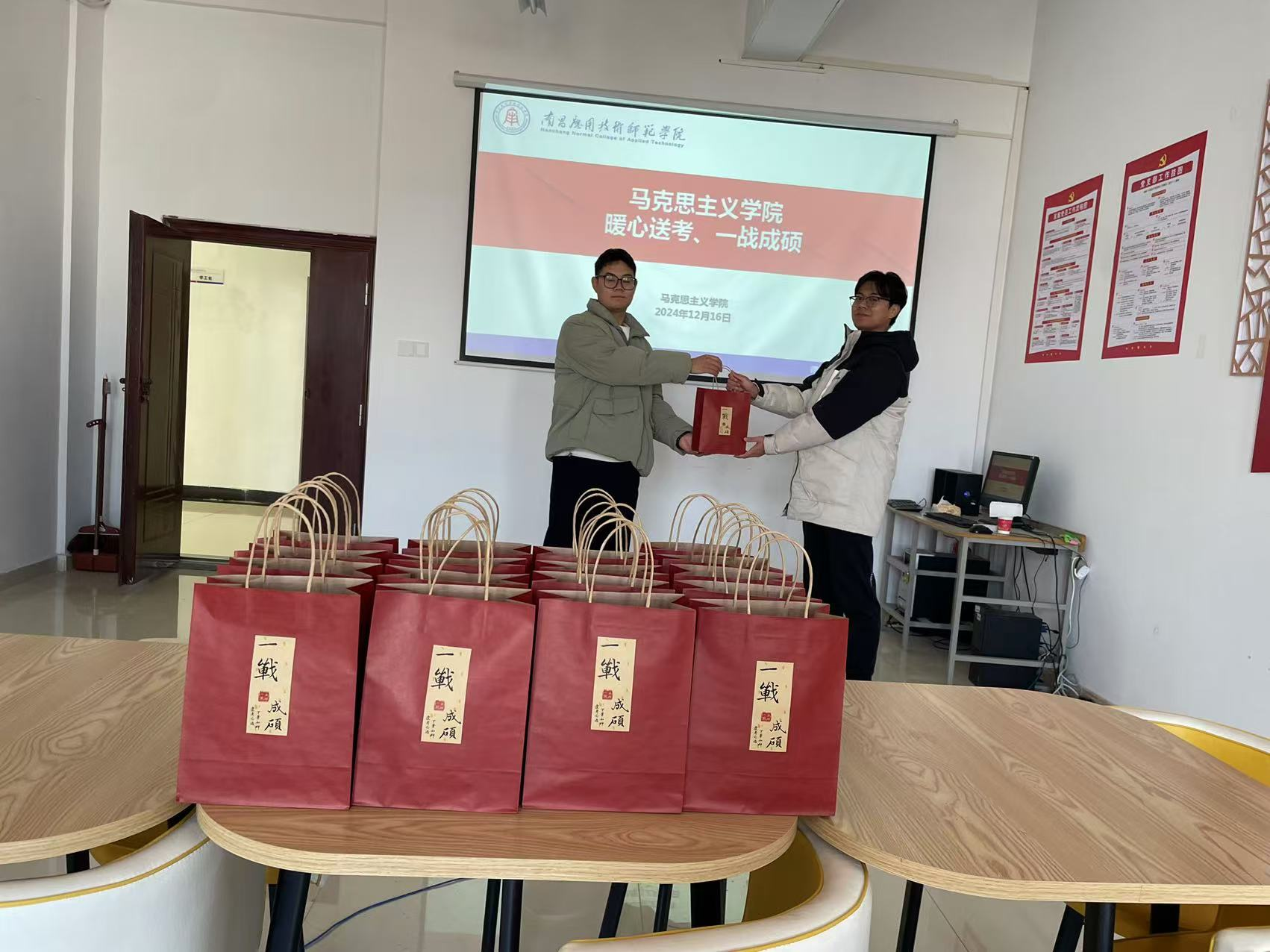 在活动开始前,学院特别为考研学子精心准备了一份充满温暖与祝福的礼物包。礼物包中包含了学弟学妹们亲手写的祝福卡片,寄托了他们对学长学姐的美好期望与鼓励;一条柔软舒适的毛巾,为考生们提供实用的日常呵护;暖身贴,帮助考生在寒冷的天气中保持温暖,舒缓身心压力;此外,还有一个象征着“功成名就、一举夺魁”的精美挂件,寓意着学院对每一位考研学子的美好祝愿,希望他们在即将到来的考试中大展宏图、顺利取得佳绩。这份用心准备的礼物,不仅传递了学院的关怀,也让考研学子们感受到了温暖与力量,激励他们以更加坚定的信心迎接未来的挑战。