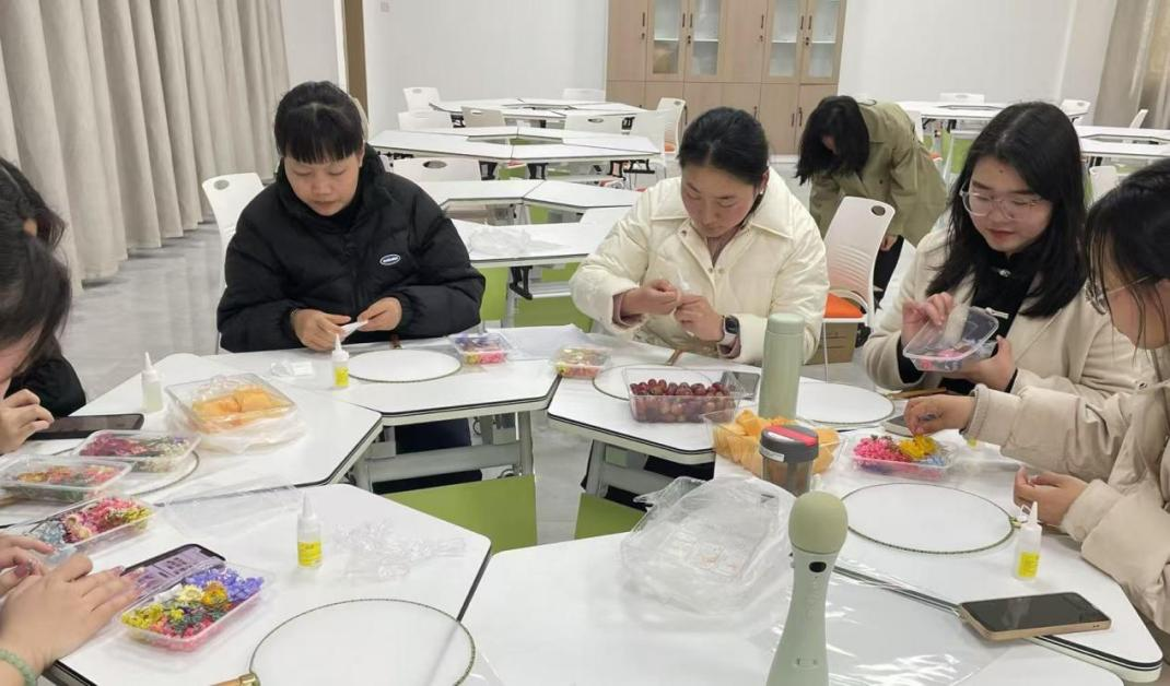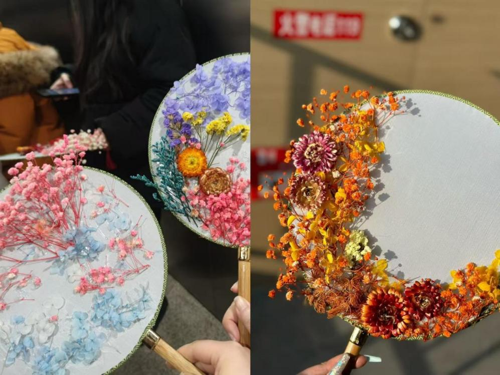 随后,女教职工们围在一起制作手工团扇,她们发挥个人创意,精心搭配花材,将普通花材粘贴在扇面上,从而变成一件件独具匠心的作品,每一件都饱含着她们对美的理解。