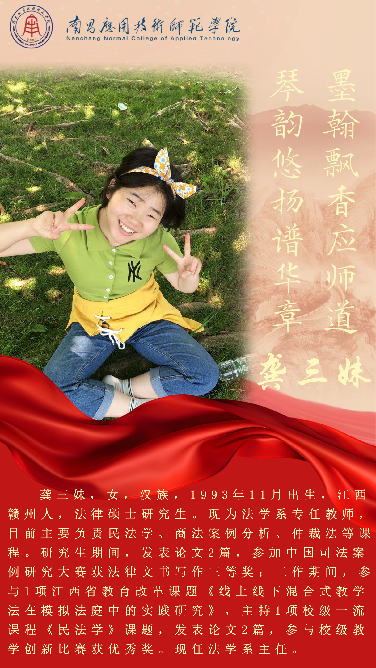 先进典型 优秀毕业生 优秀在校生 优秀教职工 您现在的位置是:首页 > 先进典型 > 优秀教职工 龚三妹 法学系主任 管理员2025-06-091810 上一篇 李婷 思想政治教育公共课系主任 下一篇 戴瑞轩 思想政治教育系主任