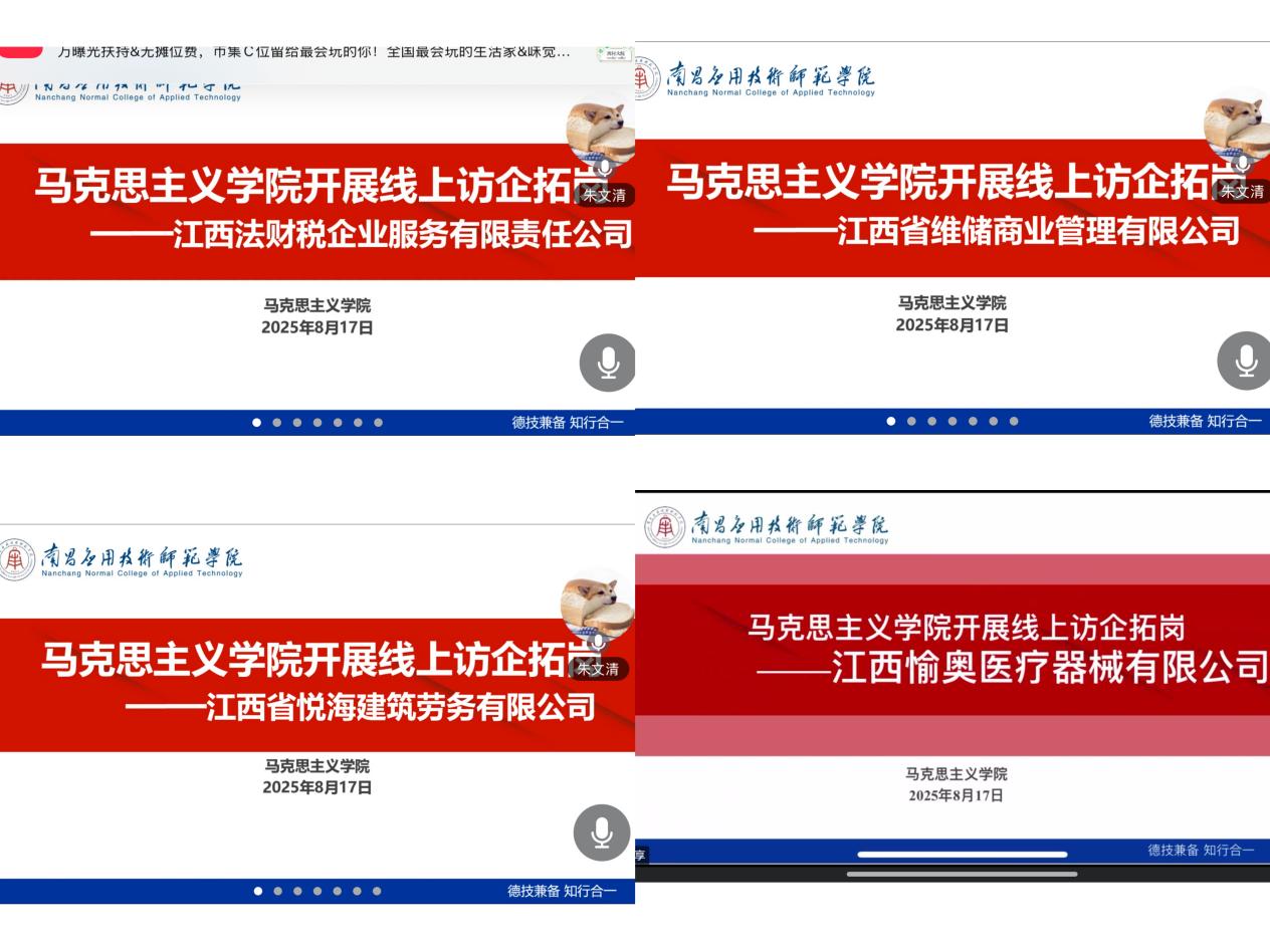 2025年8月17日上午,pp电子官网与江西法财税企业服务有限责任公司、江西省维储商业管理有限公司、江西省悦海建筑劳务有限公司、江西愉奥医疗器械有限公司开展校企合作,洽谈会在腾讯会议举行。pp电子官网党总支书记张欣康,企业领导参加会议,会议由朱文清主持。