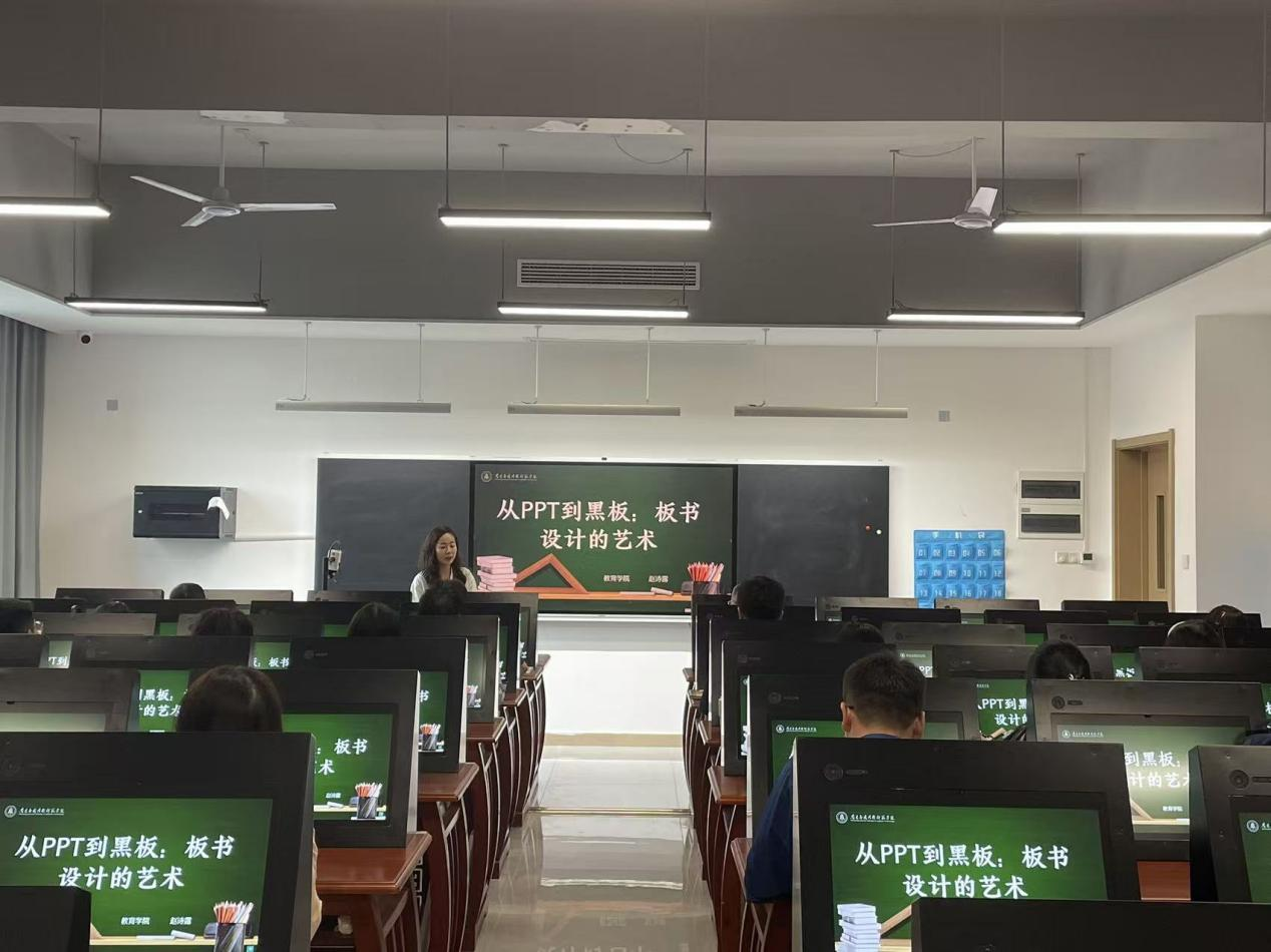 为进一步夯实教师教学基本功,推动课堂教学质量持续优化,9 月 30 日下午,教育学院赵诗露老师在沁苑十实 408 教室为全院教师带来一场主题为 “从 PPT 到黑板:板书设计的艺术”的课堂教学板书技能经验交流会。pp电子副院长刘德彰、院长助理杨志明以及全体专任教师参会,会议由学院教务科负责人李文静主持。